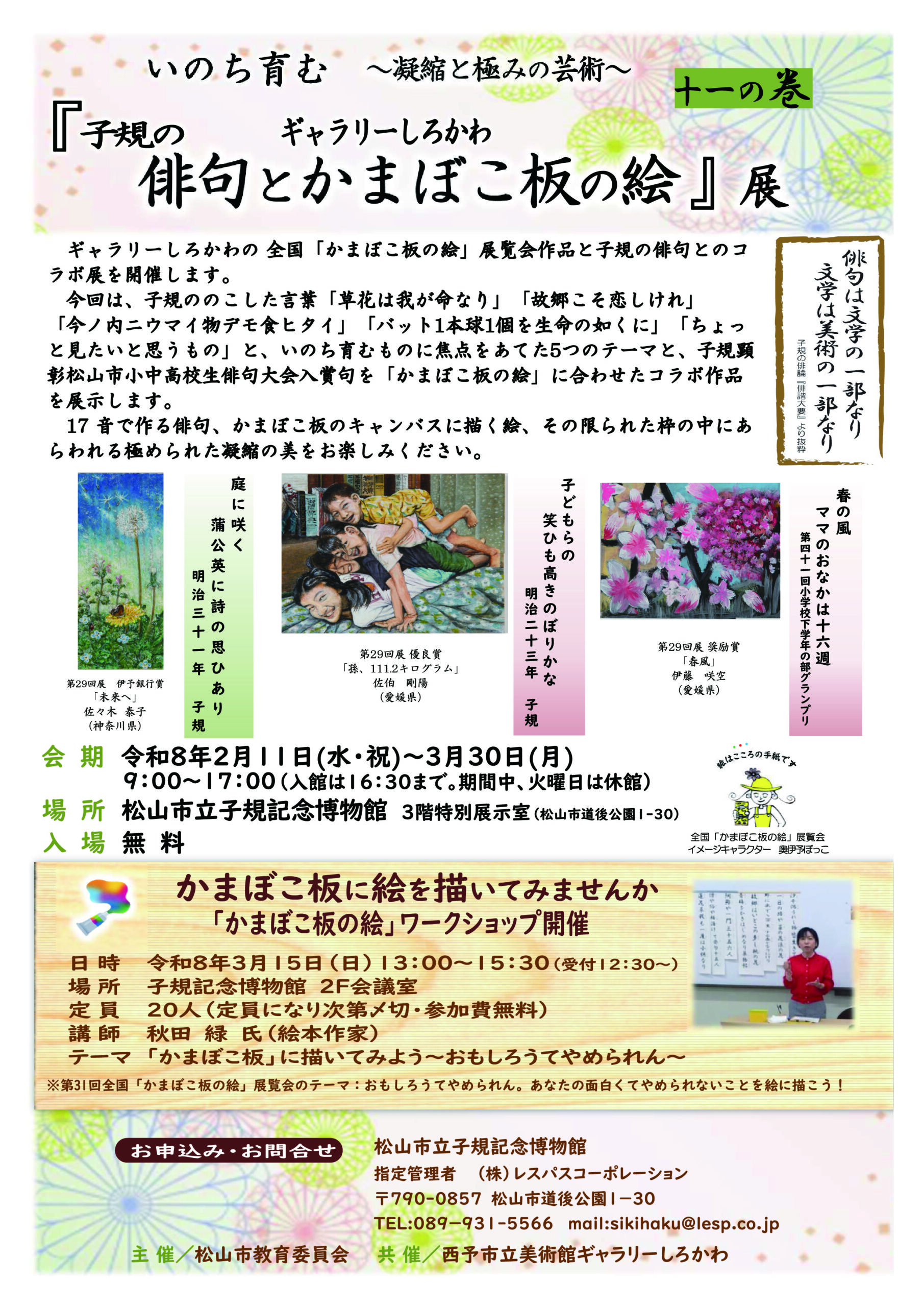 いのち育む~凝縮と極みの芸術~「子規の俳句とかまぼこ板の絵」展 十一の巻 開催 2026-02-112026-03-30 いのち育む~凝縮と極みの芸術~「子規の俳句とかまぼこ板の絵」展 十一の巻を開催し