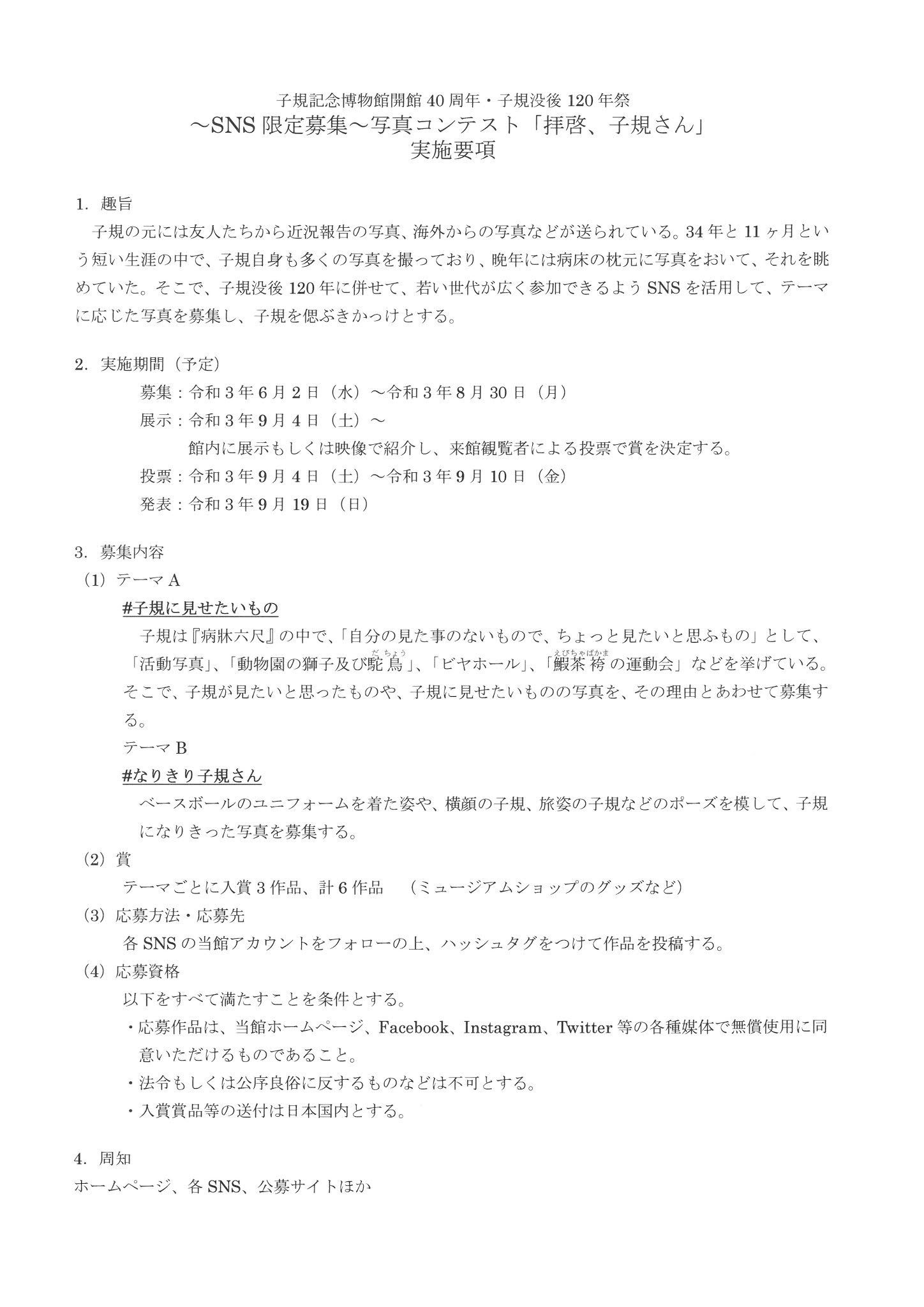 ベースボールのユニフォーム姿を着た姿や、横顔の子規、旅姿の子規などのポーズを模して、子規になりきった写真を募集します。