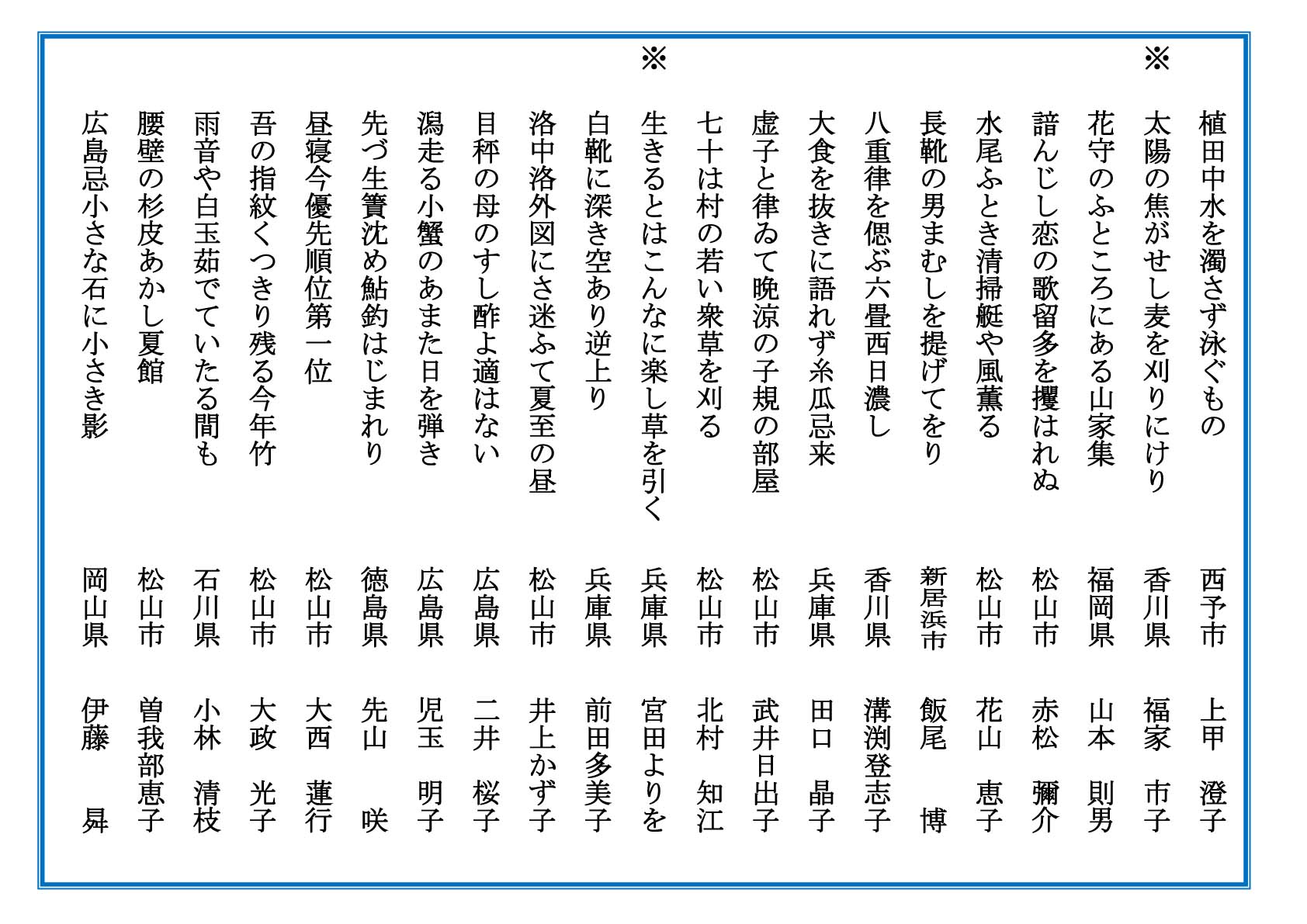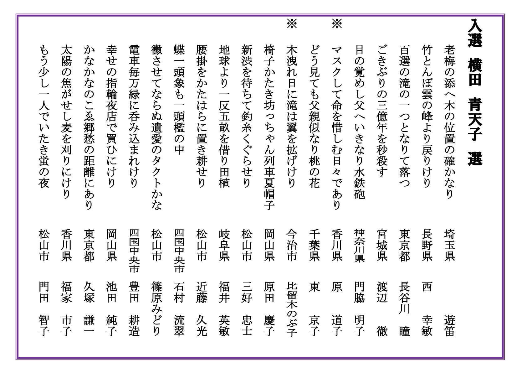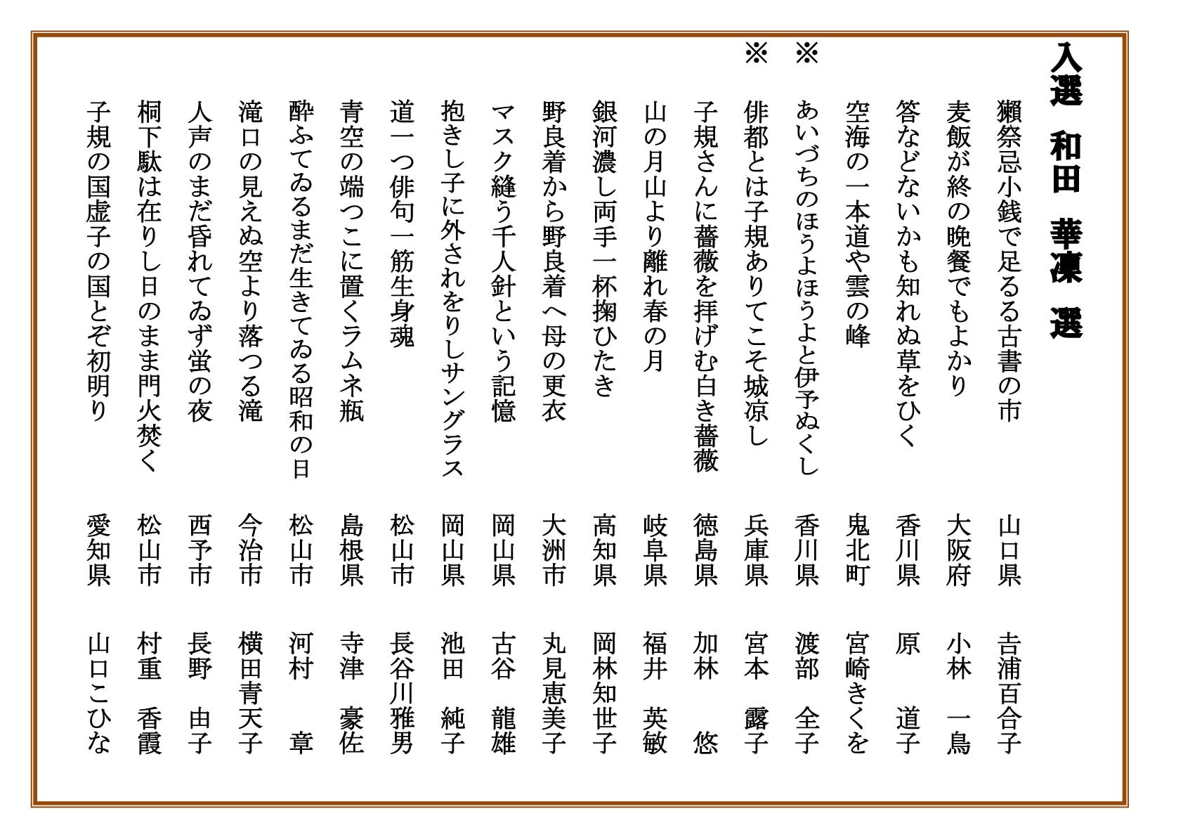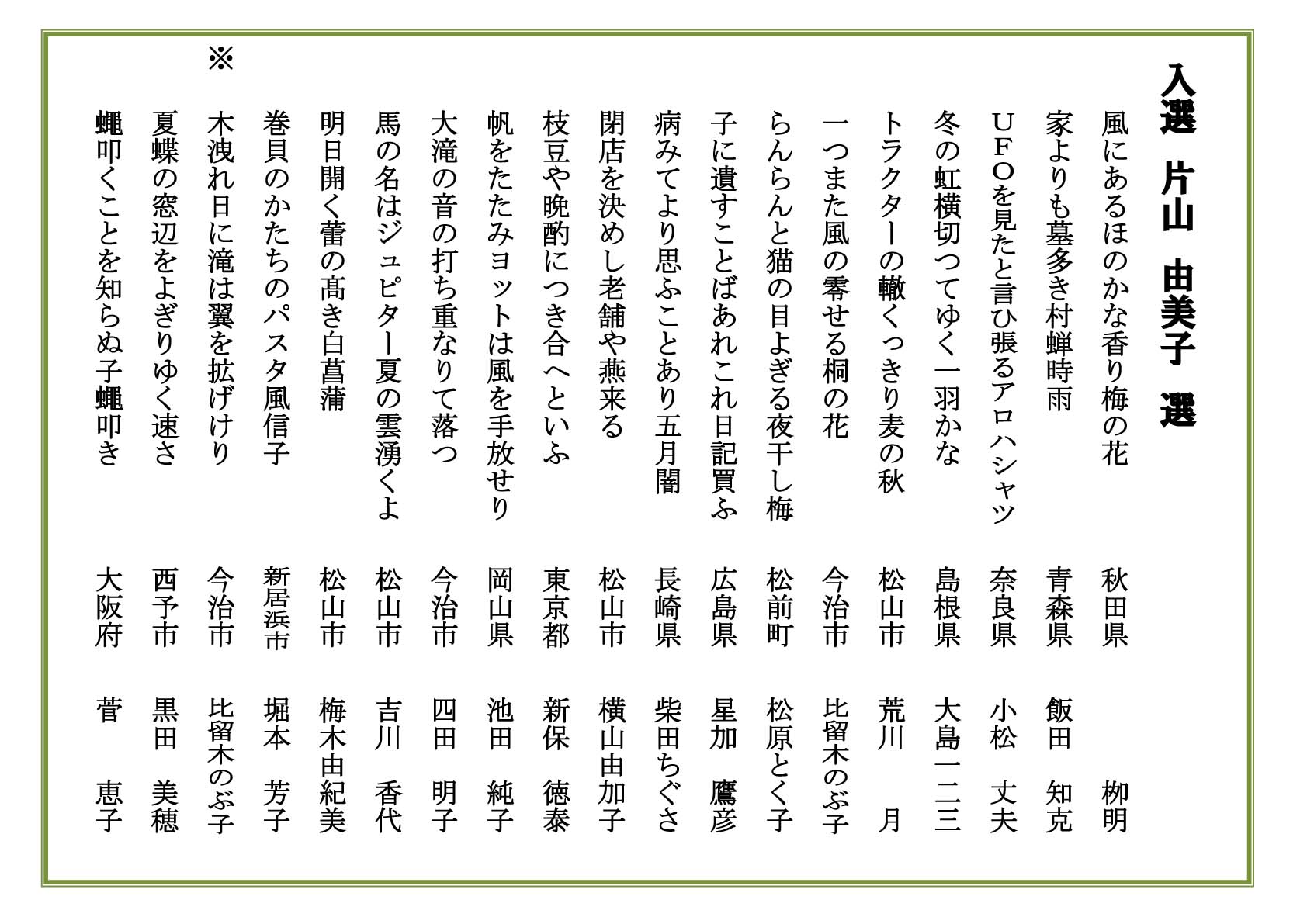 2020.09.22 子規顕彰全国俳句大会 第55回子規顕彰全国俳句大会入賞発表【入選】 第55回子規顕彰俳句大会 入選句を発表します。 お知らせ一覧へ戻る アーカイブ 月を選択 2026年2月 2026年1月 2025年12月 2025年11月 2025年10月 2025年9月 2025年7月 2025年6月 2025年5月 2025年4月 2025年3月 2024年12月 2024年11月 2024年10月 2024年9月 2024年8月 2024年7月 2024年6月 2024年5月 2024年4月 2024年3月 2024年2月 2024年1月 2023年12月 2023年11月 2023年10月 2023年9月 2023年8月 2023年7月 2023年6月 2023年5月 2023年4月 2023年3月 2023年2月 2022年12月 2022年11月 2022年10月 2022年9月 2022年8月 2022年7月 2022年6月 2022年5月 2022年4月 2022年3月 2022年2月 2022年1月 2021年11月 2021年10月 2021年9月 2021年7月 2021年6月 2021年5月 2021年4月 2021年3月 2020年11月 2020年10月 2020年9月 2020年8月 2020年7月 2020年5月 2020年4月 2020年3月 2020年2月 2020年1月 2019年12月 2019年11月 2019年10月 2019年9月 2019年8月 2019年7月 2019年5月 2019年4月 2019年3月 2019年2月 2019年1月 2018年11月 2018年9月 2018年8月 2018年7月 2018年6月 2018年5月 2018年4月 2018年3月 2018年2月 2018年1月 2017年11月 2017年10月 2017年9月 2017年8月 2017年7月 2017年5月 2017年4月 2017年2月 2017年1月 2016年12月 2016年11月 2016年10月 2016年9月 2016年8月 2016年4月 2016年2月 2016年1月 2015年11月 2015年10月 2015年9月 2015年8月 2015年6月 2015年5月 2015年4月 2015年1月 2014年12月 2014年6月 2014年5月 2014年4月 2014年3月 2014年1月 2013年11月 2013年8月 2013年6月 2013年5月 2013年3月 2013年1月 2012年12月 2012年11月 2012年10月 2012年9月 2012年8月 2012年4月 2012年2月 2011年11月 2011年10月 2011年9月 2011年8月 カテゴリー お知らせ 事業レポート 募集事業イベント ジュニア養成講座・研究講座 はがき歌全国コンテスト 主なご講演(子規塾など) 子規誕生祭―のぼさんとあそぼ秋祭り― 子規顕彰全国俳句大会 子規顕彰全国短歌大会 子規顕彰松山市小中高校生俳句大会 糸瓜忌・へちまコンテスト 自主事業(ツアー企画・特別企画など)
