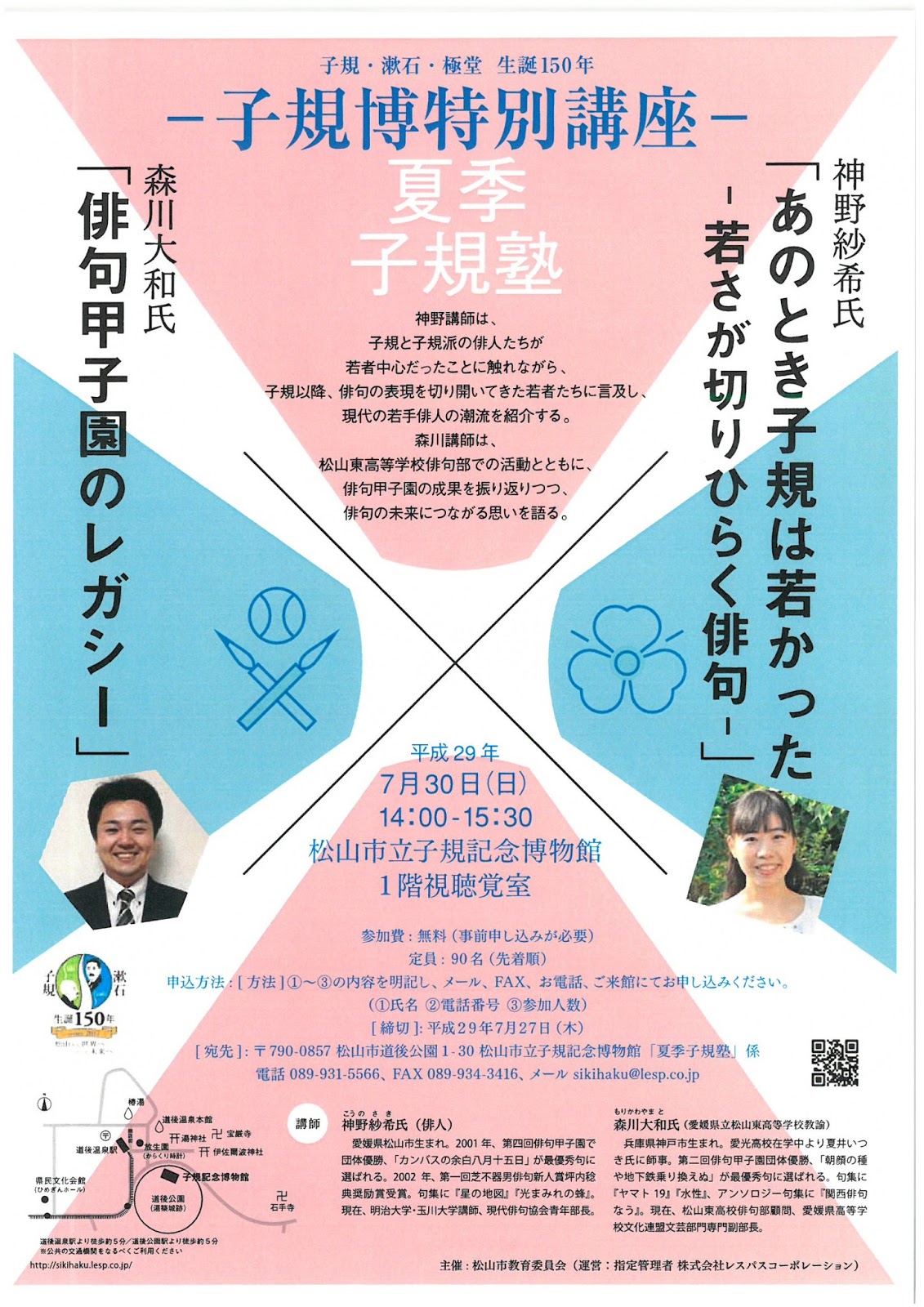 今年度の夏季季子規塾では俳人で明治大学・玉川大学講師の神野紗希(こうのさき)先生と松山東高等学校教諭の森川大和先生にご講演をいただきます。聴講は無料。