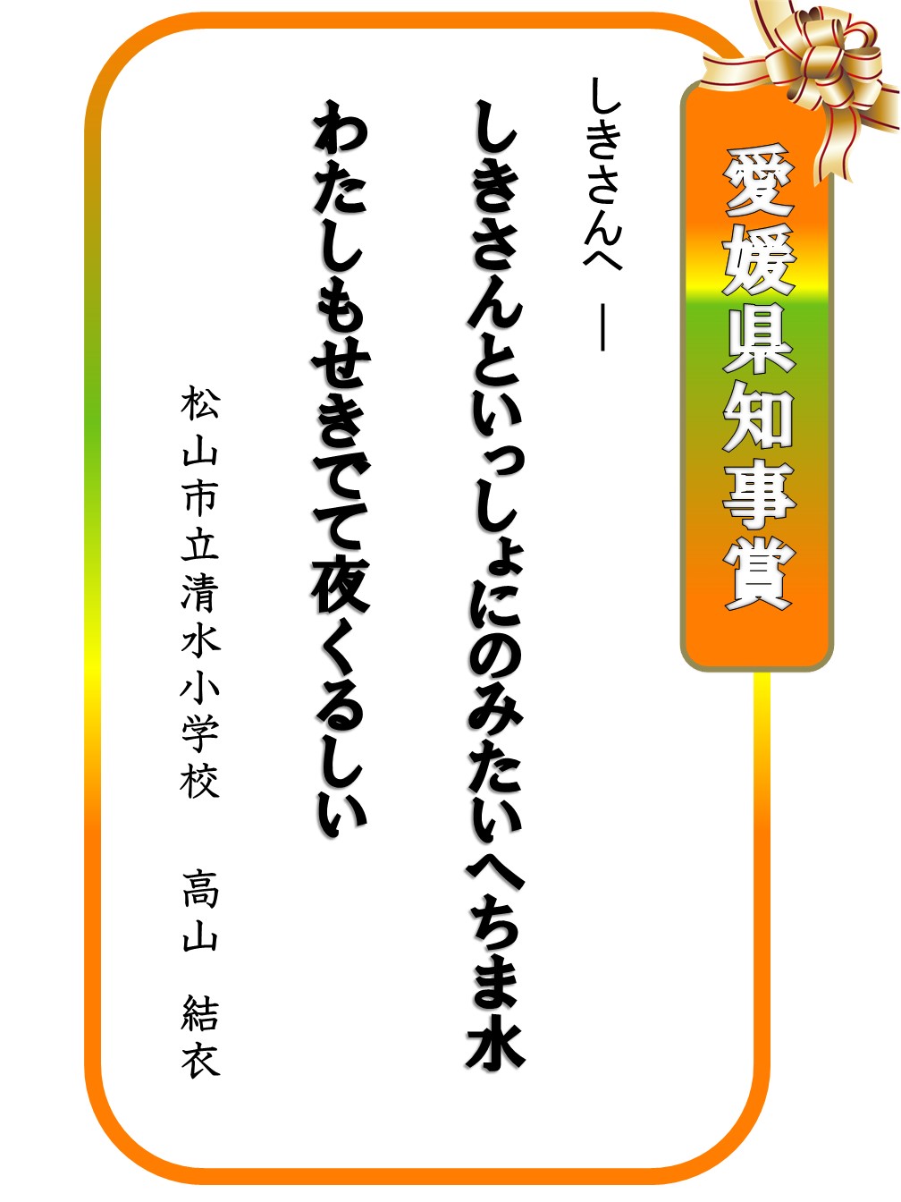 2017.04.01 はがき歌全国コンテスト 第22回はがき歌全国コンテスト上位賞紹介 上位賞に選ばれた作品を紹介します。 お知らせ一覧へ戻る アーカイブ 月を選択 2025年12月 2025年11月 2025年10月 2025年9月 2025年7月 2025年6月 2025年5月 2025年4月 2025年3月 2024年12月 2024年11月 2024年10月 2024年9月 2024年8月 2024年7月 2024年6月 2024年5月 2024年4月 2024年3月 2024年2月 2024年1月 2023年12月 2023年11月 2023年10月 2023年9月 2023年8月 2023年7月 2023年6月 2023年5月 2023年4月 2023年3月 2023年2月 2022年12月 2022年11月 2022年10月 2022年9月 2022年8月 2022年7月 2022年6月 2022年5月 2022年4月 2022年3月 2022年2月 2022年1月 2021年11月 2021年10月 2021年9月 2021年7月 2021年6月 2021年5月 2021年4月 2021年3月 2020年11月 2020年10月 2020年9月 2020年8月 2020年7月 2020年5月 2020年4月 2020年3月 2020年2月 2020年1月 2019年12月 2019年11月 2019年10月 2019年9月 2019年8月 2019年7月 2019年5月 2019年4月 2019年3月 2019年2月 2019年1月 2018年11月 2018年9月 2018年8月 2018年7月 2018年6月 2018年5月 2018年4月 2018年3月 2018年2月 2018年1月 2017年11月 2017年10月 2017年9月 2017年8月 2017年7月 2017年5月 2017年4月 2017年2月 2017年1月 2016年12月 2016年11月 2016年10月 2016年9月 2016年8月 2016年4月 2016年2月 2016年1月 2015年11月 2015年10月 2015年9月 2015年8月 2015年6月 2015年5月 2015年4月 2015年1月 2014年12月 2014年6月 2014年5月 2014年4月 2014年3月 2014年1月 2013年11月 2013年8月 2013年6月 2013年5月 2013年3月 2013年1月 2012年12月 2012年11月 2012年10月 2012年9月 2012年8月 2012年4月 2012年2月 2011年11月 2011年10月 2011年9月 2011年8月 カテゴリー お知らせ 事業レポート 募集事業イベント ジュニア養成講座・研究講座 はがき歌全国コンテスト 主なご講演(子規塾など) 子規誕生祭―のぼさんとあそぼ秋祭り― 子規顕彰全国俳句大会 子規顕彰全国短歌大会 子規顕彰松山市小中高校生俳句大会 糸瓜忌・へちまコンテスト 自主事業(ツアー企画・特別企画など)