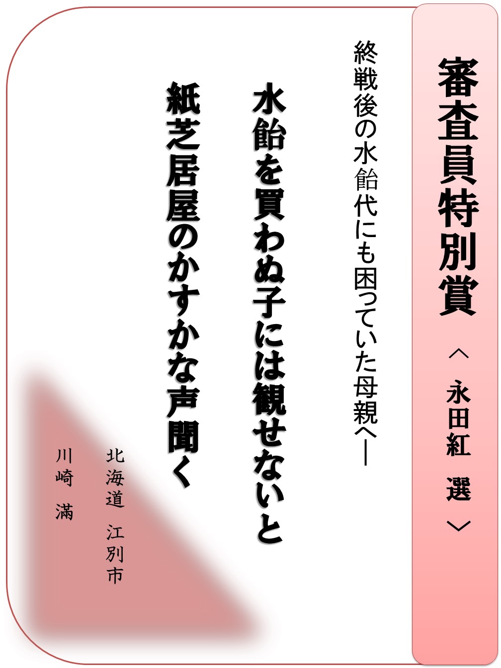 2016.04.01 はがき歌全国コンテスト 第21回はがき歌全国コンテスト 上位賞紹介 上位賞に選ばれた作品を紹介します。 お知らせ一覧へ戻る アーカイブ 月を選択 2025年12月 2025年11月 2025年10月 2025年9月 2025年7月 2025年6月 2025年5月 2025年4月 2025年3月 2024年12月 2024年11月 2024年10月 2024年9月 2024年8月 2024年7月 2024年6月 2024年5月 2024年4月 2024年3月 2024年2月 2024年1月 2023年12月 2023年11月 2023年10月 2023年9月 2023年8月 2023年7月 2023年6月 2023年5月 2023年4月 2023年3月 2023年2月 2022年12月 2022年11月 2022年10月 2022年9月 2022年8月 2022年7月 2022年6月 2022年5月 2022年4月 2022年3月 2022年2月 2022年1月 2021年11月 2021年10月 2021年9月 2021年7月 2021年6月 2021年5月 2021年4月 2021年3月 2020年11月 2020年10月 2020年9月 2020年8月 2020年7月 2020年5月 2020年4月 2020年3月 2020年2月 2020年1月 2019年12月 2019年11月 2019年10月 2019年9月 2019年8月 2019年7月 2019年5月 2019年4月 2019年3月 2019年2月 2019年1月 2018年11月 2018年9月 2018年8月 2018年7月 2018年6月 2018年5月 2018年4月 2018年3月 2018年2月 2018年1月 2017年11月 2017年10月 2017年9月 2017年8月 2017年7月 2017年5月 2017年4月 2017年2月 2017年1月 2016年12月 2016年11月 2016年10月 2016年9月 2016年8月 2016年4月 2016年2月 2016年1月 2015年11月 2015年10月 2015年9月 2015年8月 2015年6月 2015年5月 2015年4月 2015年1月 2014年12月 2014年6月 2014年5月 2014年4月 2014年3月 2014年1月 2013年11月 2013年8月 2013年6月 2013年5月 2013年3月 2013年1月 2012年12月 2012年11月 2012年10月 2012年9月 2012年8月 2012年4月 2012年2月 2011年11月 2011年10月 2011年9月 2011年8月 カテゴリー お知らせ 事業レポート 募集事業イベント ジュニア養成講座・研究講座 はがき歌全国コンテスト 主なご講演(子規塾など) 子規誕生祭―のぼさんとあそぼ秋祭り― 子規顕彰全国俳句大会 子規顕彰全国短歌大会 子規顕彰松山市小中高校生俳句大会 糸瓜忌・へちまコンテスト 自主事業(ツアー企画・特別企画など)