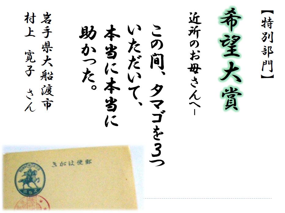 そこで今回は、そんな被災地への、あるいは被災地からの、さまざまな思いをこめたはがき歌を、特別部門として募集させていただくことにしました。