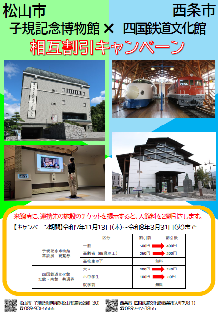 2025.11.09 お知らせ 西条市 四国鉄道文化館との相互割引キャンペーン開始 お知らせ一覧へ戻る アーカイブ 月を選択 2025年11月 2025年10月 2025年9月 2025年7月 2025年6月 2025年5月 2025年4月 2025年3月 2024年12月 2024年11月 2024年10月 2024年9月 2024年8月 2024年7月 2024年6月 2024年5月 2024年4月 2024年3月 2024年2月 2024年1月 2023年12月 2023年11月 2023年10月 2023年9月 2023年8月 2023年7月 2023年6月 2023年5月 2023年4月 2023年3月 2023年2月 2022年12月 2022年11月 2022年10月 2022年9月 2022年8月 2022年7月 2022年6月 2022年5月 2022年4月 2022年3月 2022年2月 2022年1月 2021年11月 2021年10月 2021年9月 2021年7月 2021年6月 2021年5月 2021年4月 2021年3月 2020年11月 2020年10月 2020年9月 2020年8月 2020年7月 2020年5月 2020年4月 2020年3月 2020年2月 2020年1月 2019年12月 2019年11月 2019年10月 2019年9月 2019年8月 2019年7月 2019年5月 2019年4月 2019年3月 2019年2月 2019年1月 2018年11月 2018年9月 2018年8月 2018年7月 2018年6月 2018年5月 2018年4月 2018年3月 2018年2月 2018年1月 2017年11月 2017年10月 2017年9月 2017年8月 2017年7月 2017年5月 2017年4月 2017年2月 2017年1月 2016年12月 2016年11月 2016年10月 2016年9月 2016年8月 2016年4月 2016年2月 2016年1月 2015年11月 2015年10月 2015年9月 2015年8月 2015年6月 2015年5月 2015年4月 2015年1月 2014年12月 2014年6月 2014年5月 2014年4月 2014年3月 2014年1月 2013年11月 2013年8月 2013年6月 2013年5月 2013年3月 2013年1月 2012年12月 2012年11月 2012年10月 2012年9月 2012年8月 2012年4月 2012年2月 2011年11月 2011年10月 2011年9月 2011年8月 カテゴリー お知らせ 事業レポート 募集事業イベント ジュニア養成講座・研究講座 はがき歌全国コンテスト 主なご講演(子規塾など) 子規誕生祭―のぼさんとあそぼ秋祭り― 子規顕彰全国俳句大会 子規顕彰全国短歌大会 子規顕彰松山市小中高校生俳句大会 糸瓜忌・へちまコンテスト 自主事業(ツアー企画・特別企画など)