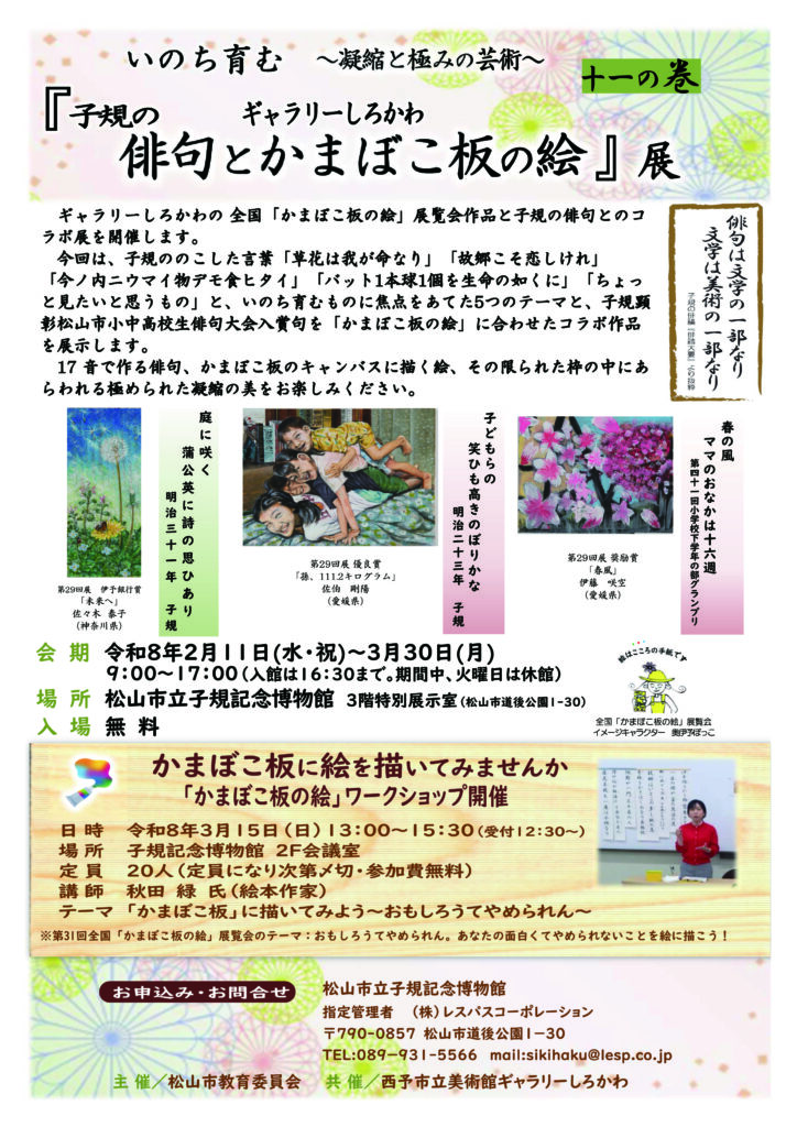 西予市立美術館ギャラリーしろかわの全国「かまぼこ板の絵」展覧会作品と子規の俳句とのコラボ展。今回は「いのち育む」に焦点をあて、子規ののこした言葉をテーマにした作品をあつめました。